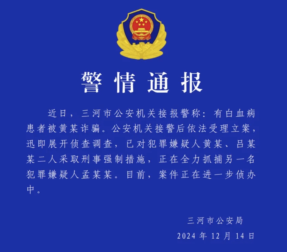 12月14日,河北三河市公安局官方微信公众号“平安三河”就“有白血病患者被诈骗”一事,发布警情通报:已对犯罪嫌疑人黄某、吕某某二人采取刑事强制措施,正在全力抓捕另一名犯罪嫌疑人孟某某。目前,案件正在进一步侦办中。