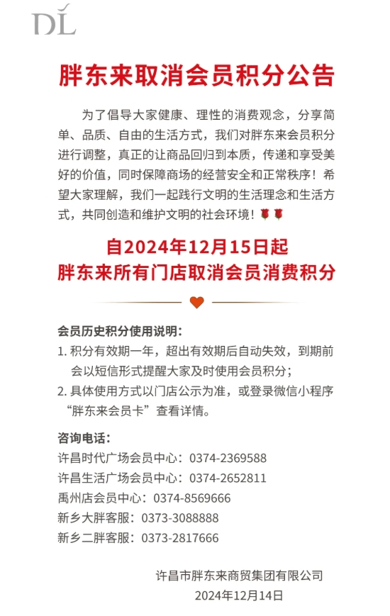 12月14日,胖东来发布取消会员积分公告:自2024年12月15日起所有门店取消会员消费积分。