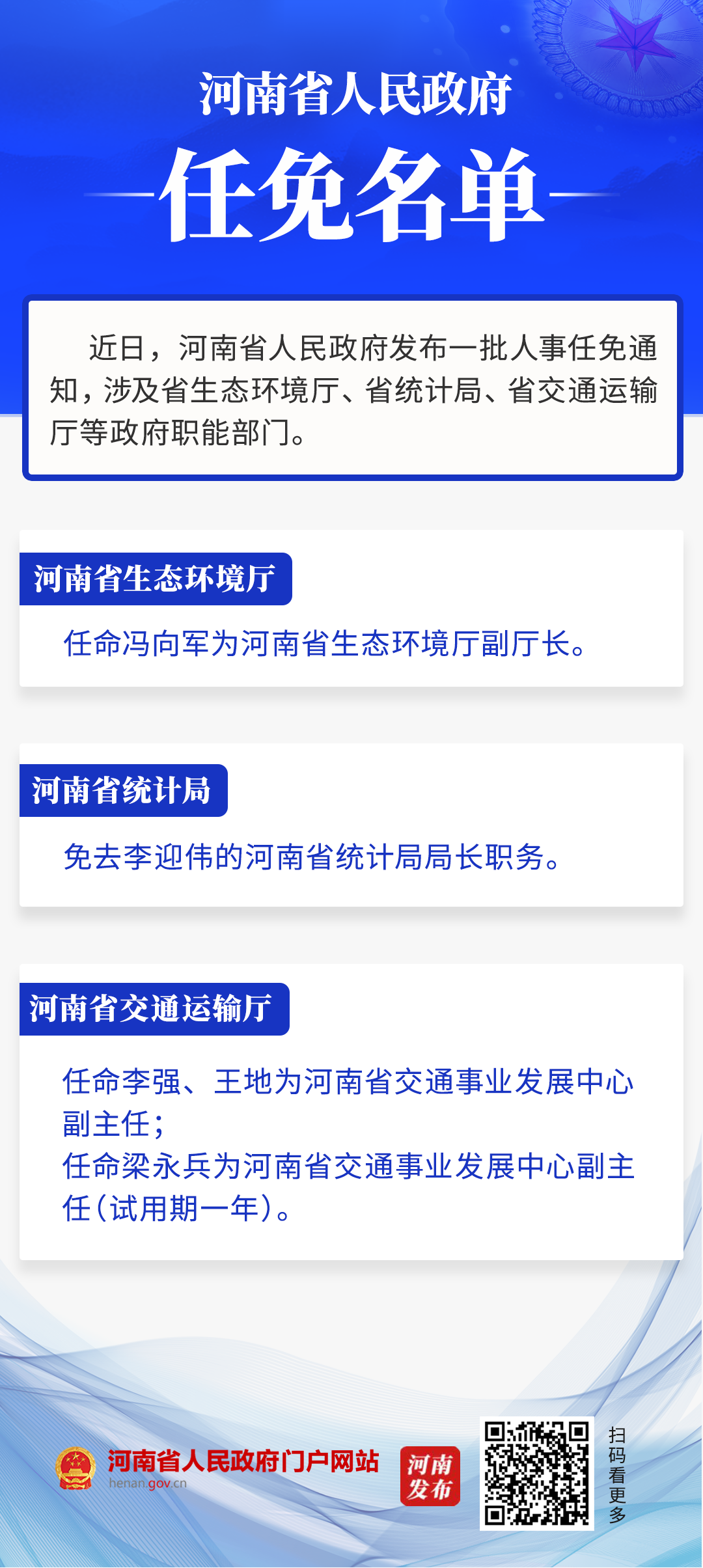 近日,河南省人民政府发布一批人事任免通知,涉及省生态环境厅、省统计局、省交通运输厅等政府职能部门。