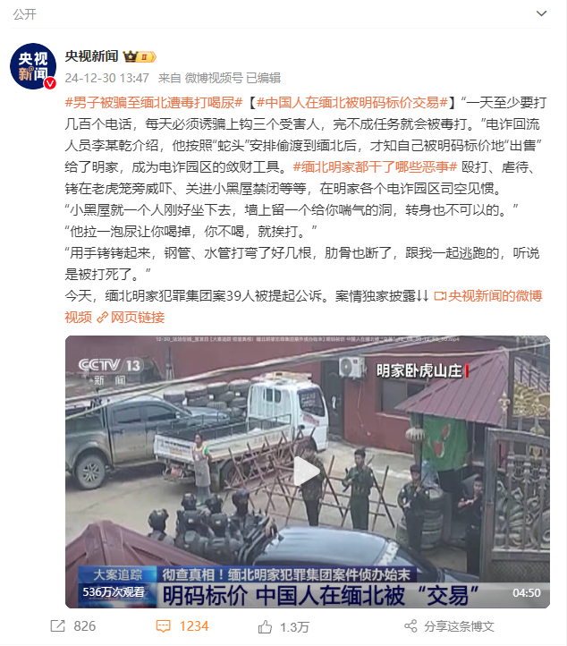 2024年12月30日,浙江省温州市人民检察院对缅北四大家族明家犯罪集团主案39名被告人依法提起公诉。缅北果敢“四大家族”被铲除,国内电信诈骗类犯罪发案数大幅下降,让怀揣“一夜暴富”的梦想前往电诈园区的不法分子彻底梦碎。电诈回流人员李某乾介绍,他按照“蛇头”安排偷渡到缅北后,才知自己被明码标价地“出售”给了明家,成为电诈园区的敛财工具。详情>>