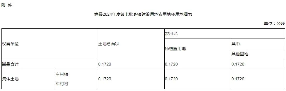 一、同意你县拟定的农用地转用方案,将嵩县车村镇车村村0.1720公顷集体农用地(全部为种植园地)转为集体建设用地,作为嵩县2024年度第七批乡镇建设用地。