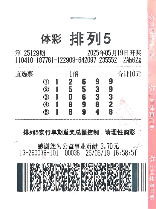体彩排列5玩法简单易懂,彩民从00000-99999中选取1个5位数字投注,号码按位一致即可收获单注10万元奖金。每张体彩排列5彩票都承载公益使命,这位中奖市民的彩票也为公益事业贡献3.70元。