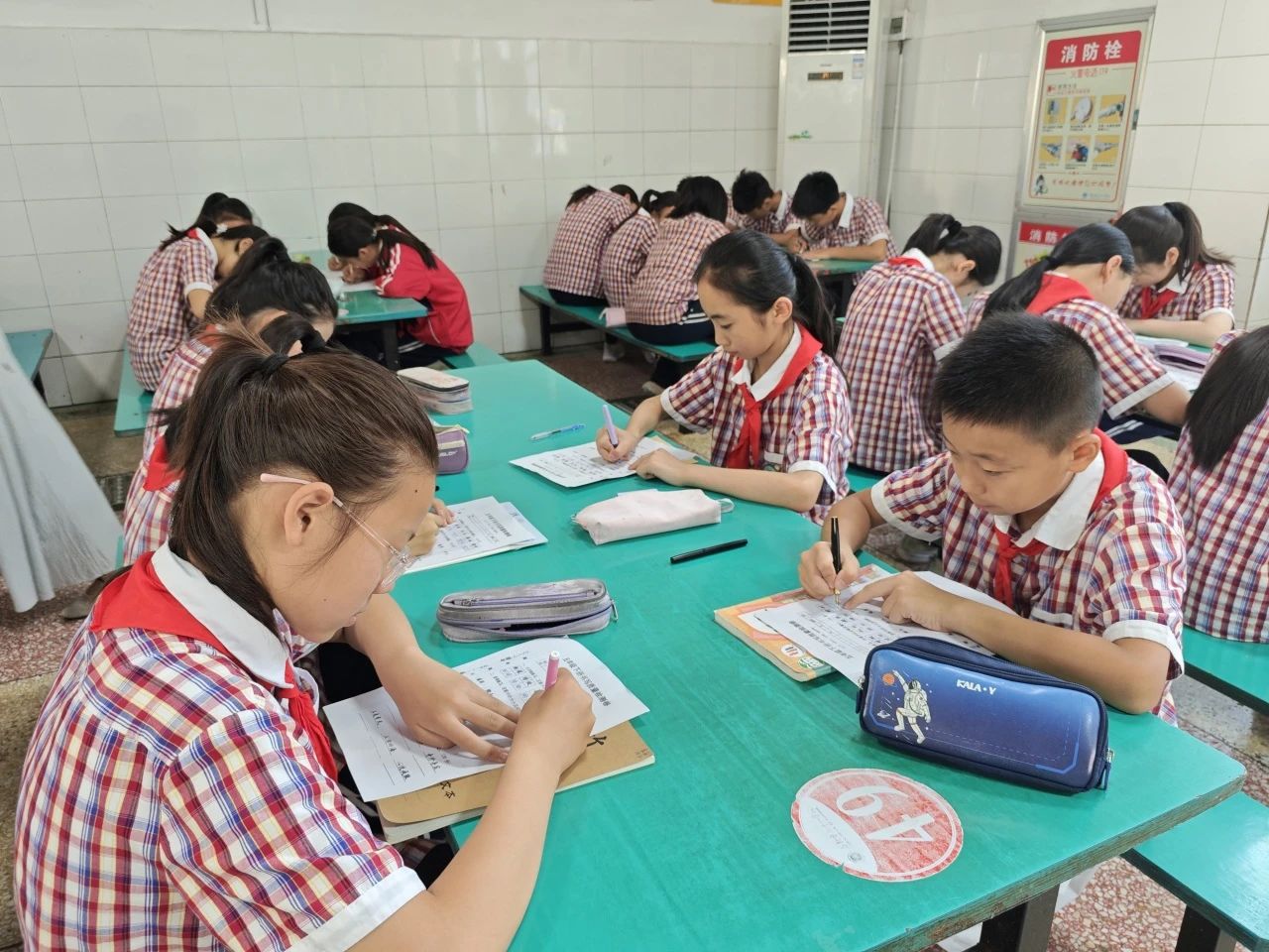 书法测评前,同学们早已对题目胸有成竹。他们端正坐姿,屏息凝神,提笔蘸墨,在宣纸上认真书写。横竖撇捺,起笔收锋,尽显书法魅力。有的同学字体工整,有的同学笔力苍劲有力,每一个字都凝聚着他们平日里的刻苦练习。老师们在一旁仔细观察,对同学们的握笔姿势、笔画规范、整体布局等方面进行细致评价,引导同学们感受书法艺术的博大精深,传承中华优秀传统文化。