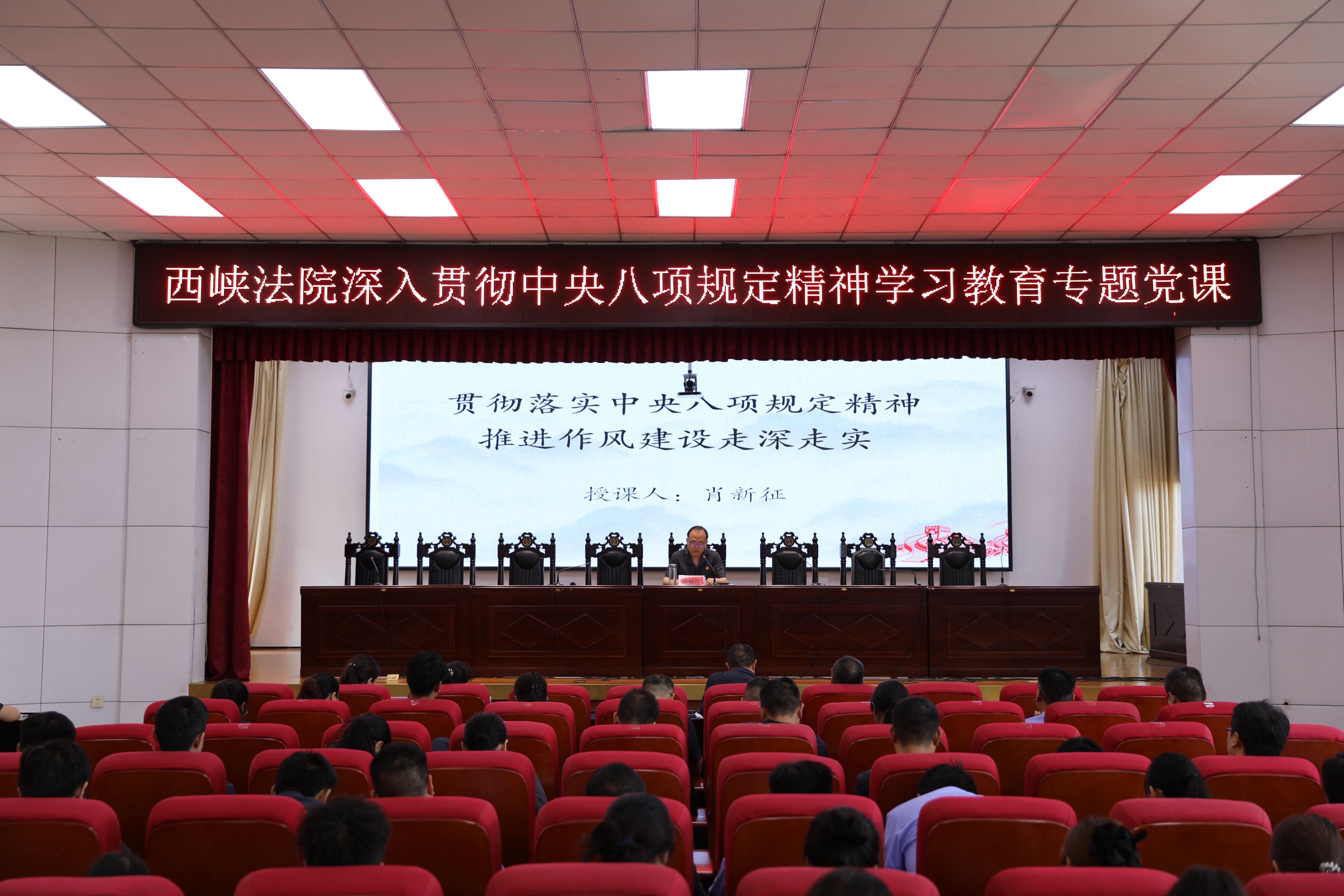 在迎接中国共产党成立104周年之际,为深入贯彻中央八项规定精神,传承党的优良作风,6月27日上午,西峡县人民法院党组书记、院长肖新征以《贯彻落实中央八项规定精神 推进作风建设走深走实》为题,为全院干警讲授专题党课。