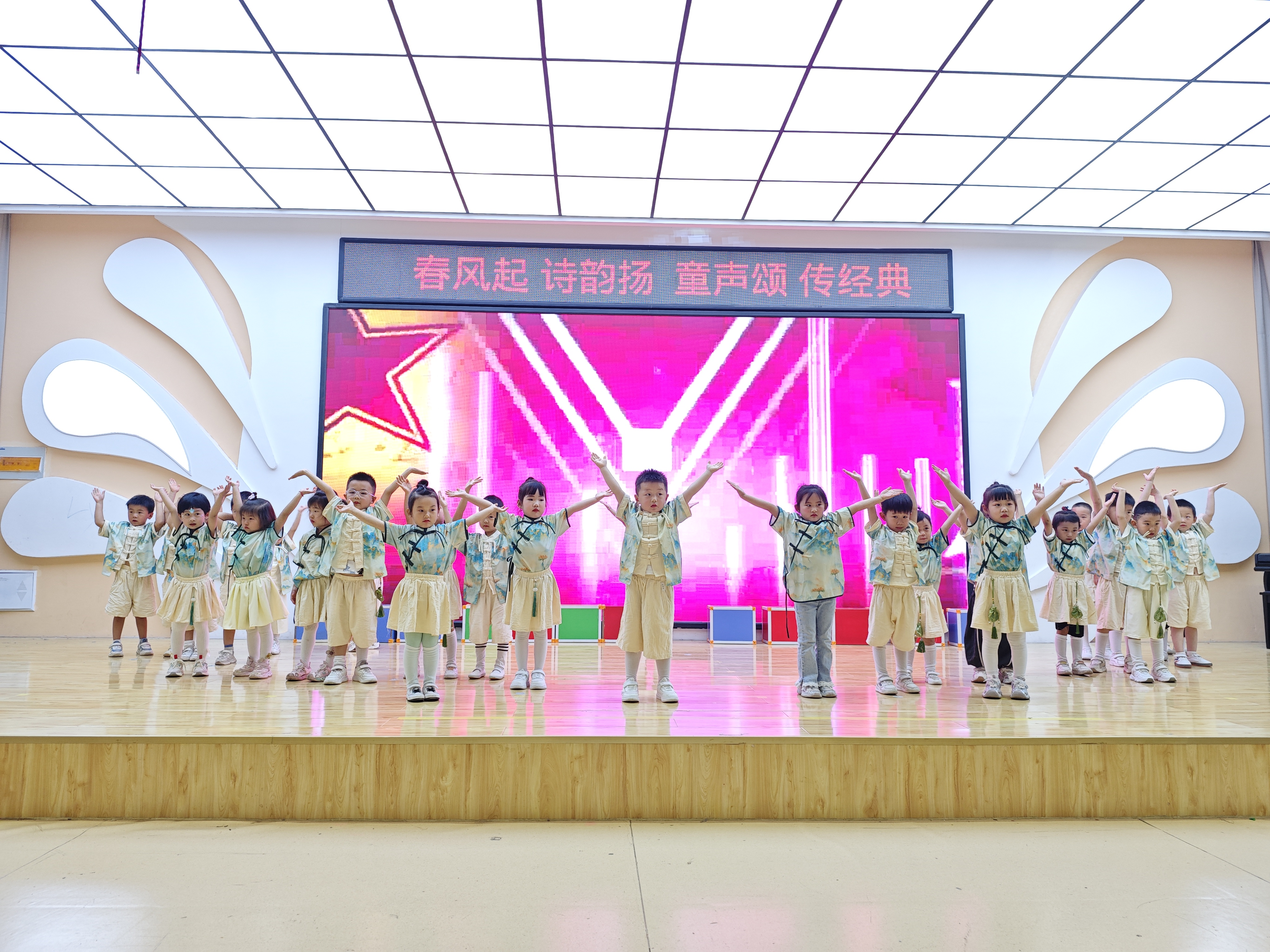 5月19日,范县第二幼儿园内诗韵悠扬,童声朗朗,一场以“春风起 诗韵扬 童声颂 传经典”为主题的传统文化活动在这里举行。活动现场,小朋友们身着汉服,吟诵经典诗词,载歌载舞,以童真童趣演绎中华文化的千年风雅。