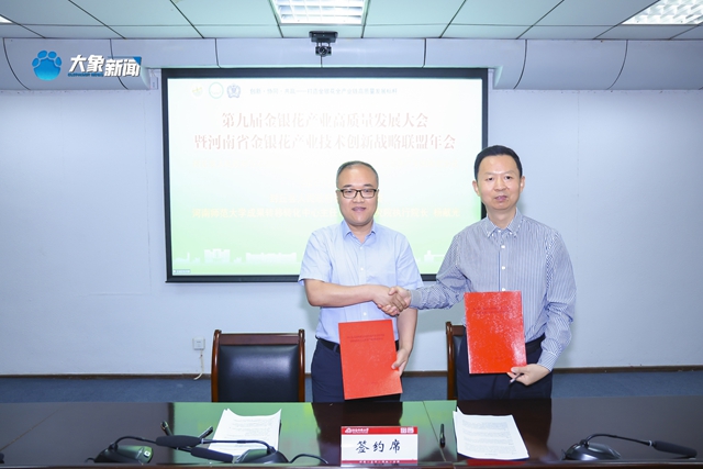 会议现场,封丘县与河师大签订战略合作协议,将共建金银花高效生态智慧产业园,促进金银花产业高质量发展。