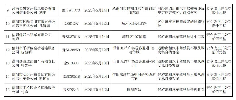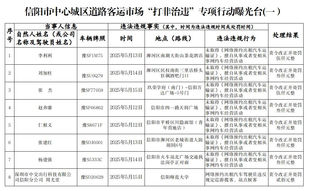 2025年5月份以来,信阳市交通运输执法系统扎实开展中心城区道路客运市场“打非治违”专项行动,持续加大道路运输市场执法监管力度,严查严处各类道路客运违法违规行为。现将近期依法查处的违法违规行为予以曝光如下: