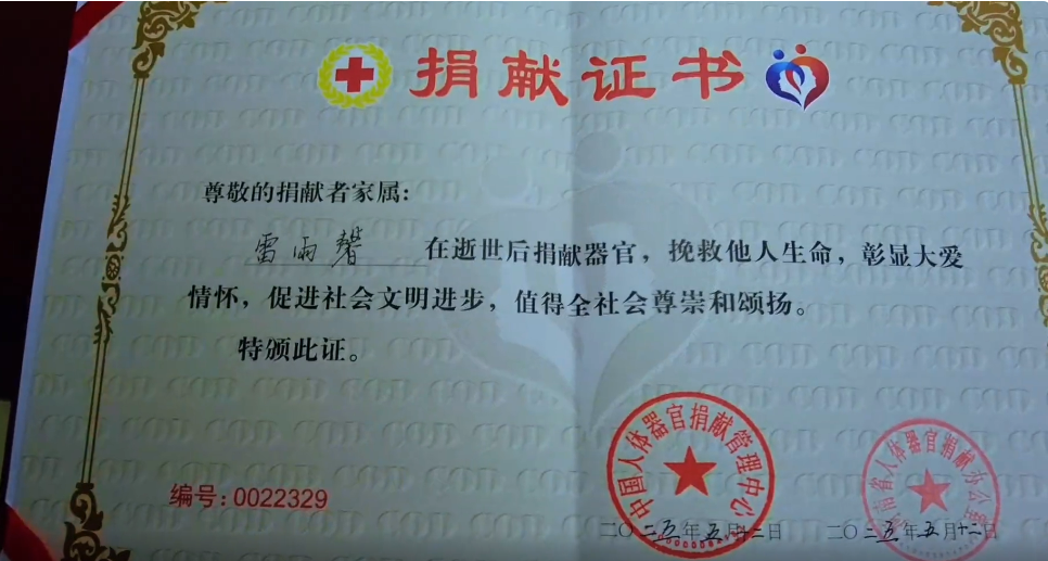 “我们用这种方式表达对她最后的爱,让她以另外一种方式在世上活着。”5月14日,信阳女孩雷雨馨的父母拿到了中国人体器官捐献管理中心和河南省人体器官捐献办公室颁发的人体器官捐献纪念章和捐献证书。两天前,雷雨馨的父母帮助她完成多个器官的捐献。