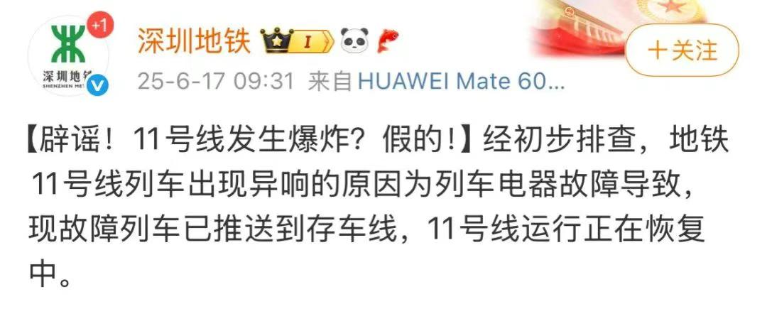 9时31分,深圳地铁官方微博发布辟谣消息:11号线发生爆炸?假的!经初步排查,地铁11号线列车出现异响的原因为列车电器故障导致,现故障列车已推送到存车线,11号线运行正在恢复中。