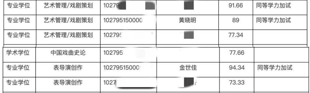 上海戏剧学院官方发布的名单显示,“金世佳”报考的是表导演创作专业学位,业务一科目成绩为94.34分,黄晓明报考的是艺术管理/戏剧策划的专业学位,业务一科目成绩为89分。